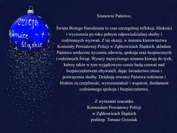 Życzenia świąteczne Komendanta Powiatowego Policji w Ząbkowicach Śląskich